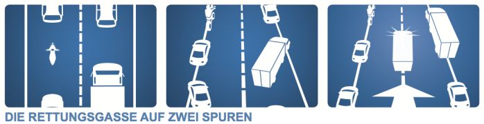 Bei zwei Spuren fahren die Fahrzeuge auf der linken Spur an den linken Rand, die Fahrzeuge auf der rechten Spur an den rechten Rand. So entsteht in der Mitte eine freie Bahn für Rettungs- und Bergungsfahrzeuge.